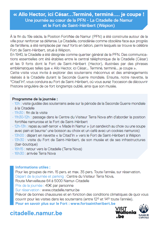 2. En collaboration avec la Citadelle de Namur, nous pouvons vous proposer une journée spéciale fortification pour le prix de 40€. Inscription : www.citadelle.namur.be
